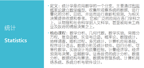 统计学主要利用概率论建立数学模型,收集所观察系统的数据,进行量化的分析、总结,并进而进行推断和预测,为相关决策提供依据和参考。它以数学作为基本工具,但又比数学更有实际用途,可以对生活中大量的无序的数据进行分析,找出它们的规律,从而为研究、决策提供基本的依据 。在美国统计学专业其实分成了统计和生物统计两大类,而后者原本只是在统计学应用里的一个分支,后来强大到单独成一个系统了,本文把统计学和生物统计都放在一起分析。