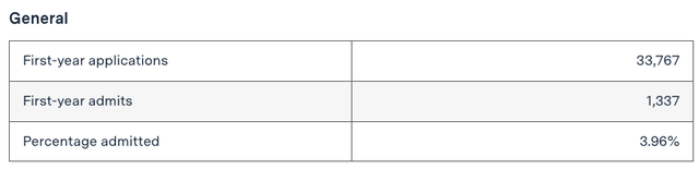 麻省理工学院最近公布了今年的本科申请(EA提早申请+常规申请)数据,和去年相比虽然人数增长率只有2%,但录取率却比去年还低,最终录取人数只有1337人,整体录取率3.96%,而去年录取率为4.1%。